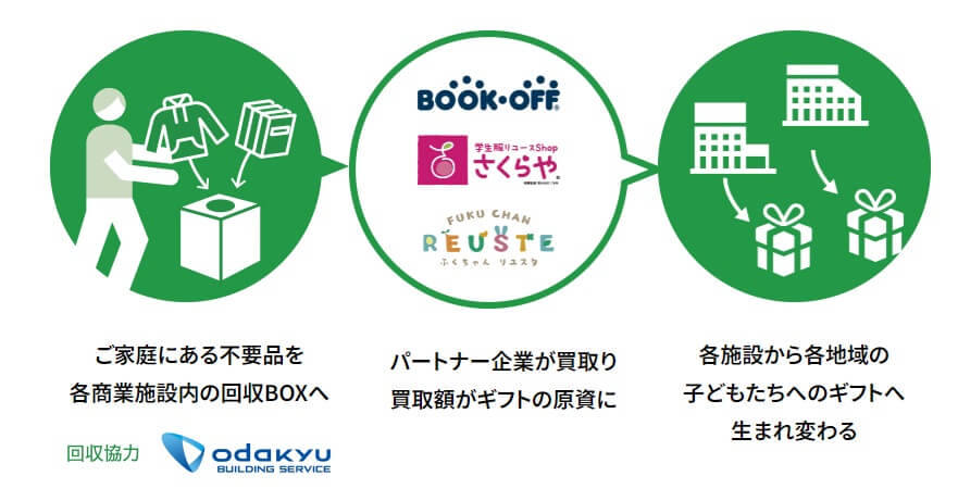 集めた品は、古着や古本の再流通に実績のあるブックオフ、学生服のリユースで知られるさくらや、衣類リユースのREGATE(ふくちゃんリユスタ)の3社が査定します。再販できる品はリユース市場に流し、その査定額を寄付金として積み立て。寄付金は沿線の自治体を通じて絵本や遊具、防災用品などの支援品に変え、子育て家庭に届けられます。